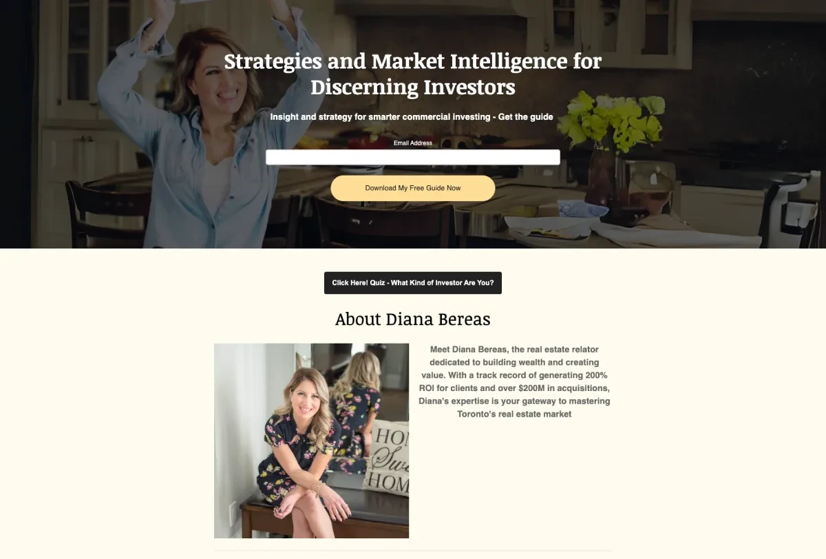Mobile‑first landing page; free neighborhood guide; Mailchimp welcome + follow‑ups.